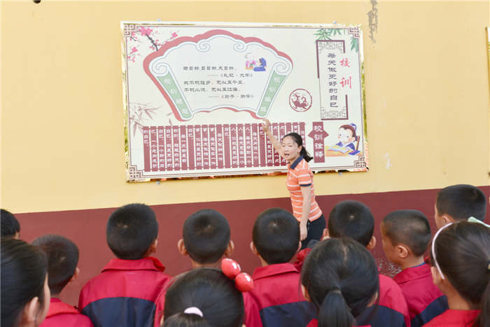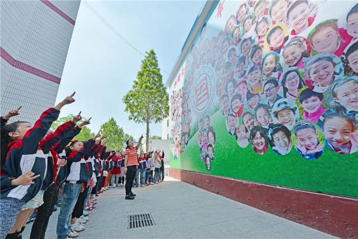 三是突出学生设计,让学生站在学校中央。学校楼顶的校名、校风、校训大字,全部是由学生书写,让学生充分感受到自己真正是学校的主人;教学楼悬挂的书法、绘画作品全部由学生书写;教学楼西68米的社会主义核心价值主题墙,由学生发挥自己想象力,自主绘画完成,并配上学生对社会主义核心价值观的独特的解读。例如:六年级五班王淑瑞对和谐的解读是:为了小家为大家,你有事情我来帮。和谐相处暖人心,文明友善健又康……打造适合学生发展的“圣贤教育”的主题校园文化,将传统文化和社会主义核心价值观相融合,使孩子们随时接受到中华传统美德教育的熏陶,在潜移默化中达到育人的效果。