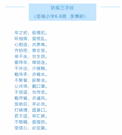 为此,孩子们自己编写《防疫三字经》,同心战“疫”: