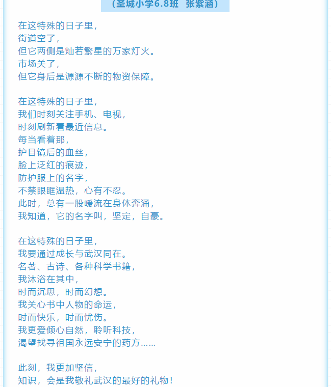 看似是一首诗,可文字背后的力量不容小觑,孩子们用诗歌的形式表达了对疫情的持续关注,对祖国的关切之心,这是作为学生在家中能尽的一己之力。当然,在孩子们的背后还有为学生的学习、身心健康一直默默奉献的老师们,他们是孩子们背后强有力的支撑!面对疫情,携手并肩;面对疫情,众志成城;面对疫情,满怀信心。希望我们共同努力,共同抗击疫情,共同等待春暖花开时,共同期待新学期的到来!