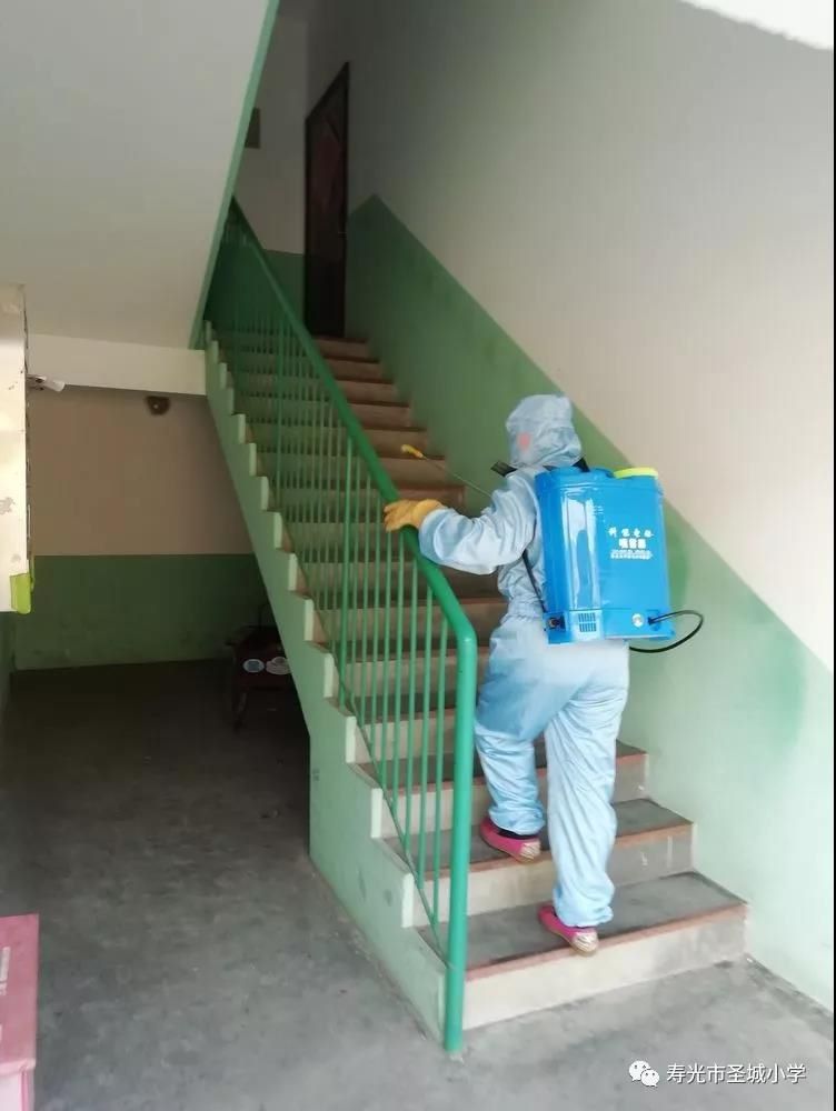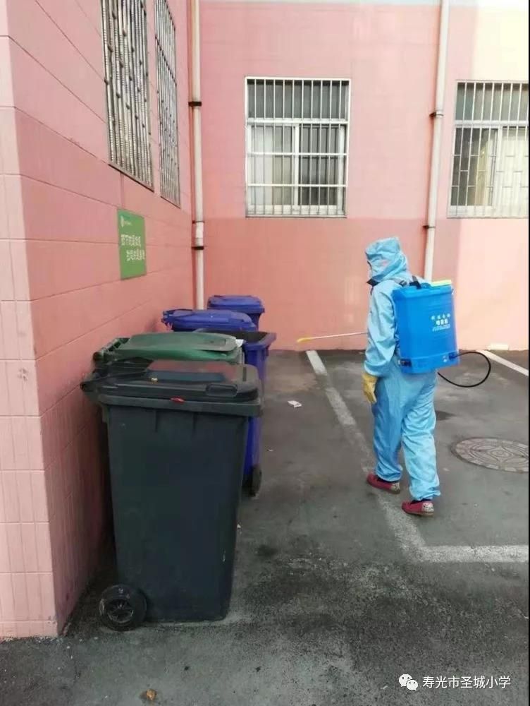 8点18分,学校后勤人员做好个人防护后,准时开始了一天的消毒工作。将84消毒液按比例稀释后装入消毒罐,对办公区域,家属楼道,门把手,垃圾桶……任何位置都不放过。