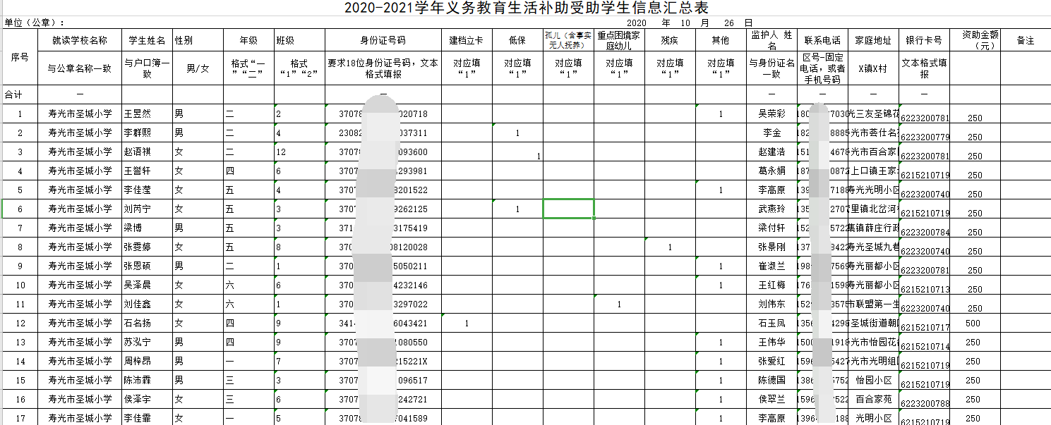 2020-2021学年义务教育生活补助受助学生信息汇总表