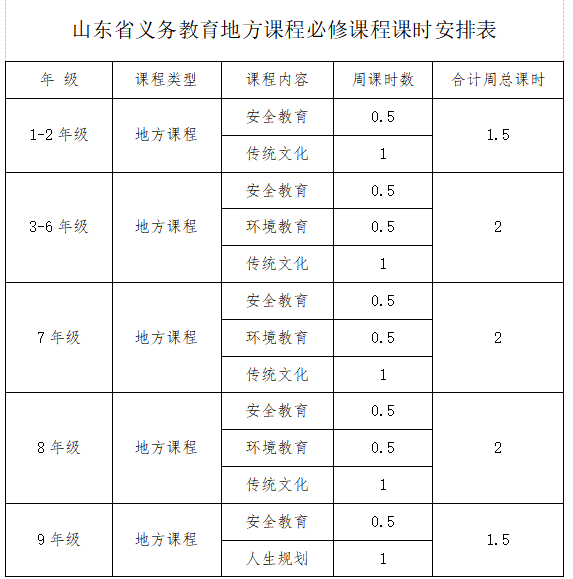 山东省义务教育地方课程必修课程课时安排表