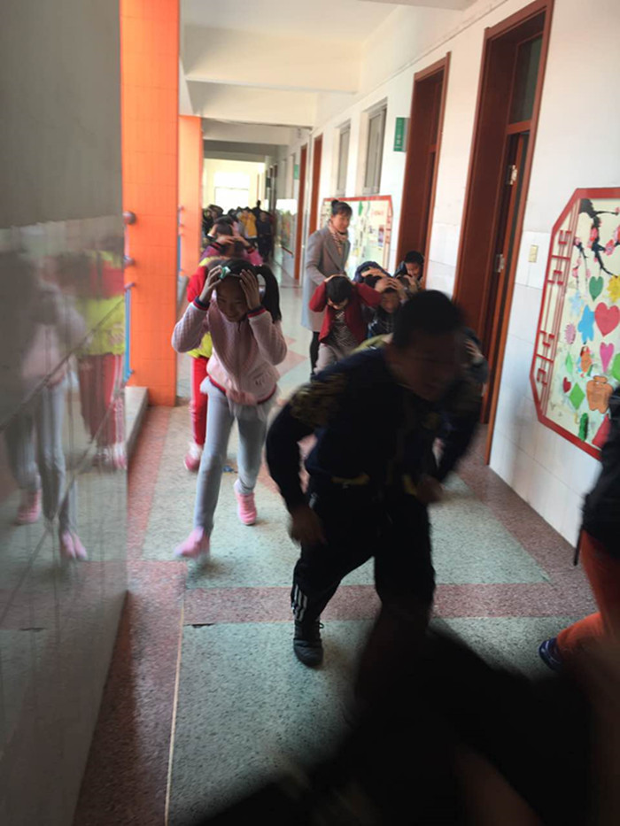 9点30分,随着警报声的响起,全校师生都进入高度紧张的积极防震状态,在班主任的指导下迅速就近躲避,伴随第二次警报声响起,班主任立即组织学生抱头,沿着规定路线,在楼梯口老师的指引下,快速有序地向预定地点紧急疏散,到达集合点后,教师清点人数。