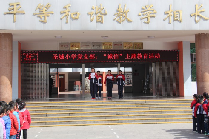 4月10日,圣城小学全体师生在一个阳光明媚上午,齐聚圣贤广场,开展“诚信”主题教育活动启动仪式。在庄严的国歌声中,拉开了四月“诚信”主题教育活动的序幕。
