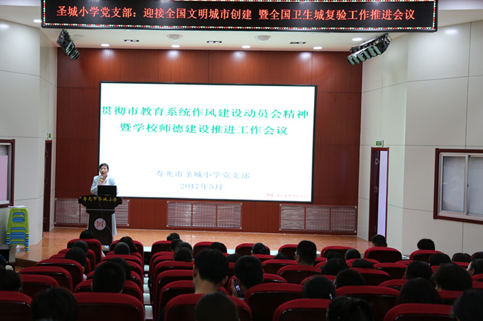 为贯彻落实市教育局召开的全市教育系统党风廉政建设暨作风建设年活动动员、迎接全国文明城市、全国卫生城市创建等会议精神,圣城小学于5月8日在圣贤学堂召开专题会议,就学校党风廉政建设和师德师风建设、创城等工作进行安排部署,圣城小学副校长李政主持会议。