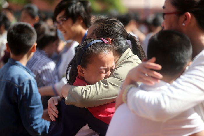 孩子、家长、老师几千人席地而坐,韩高波校长的寄语、学生与老师共同表演的诗朗诵《母亲的赞歌》,王金英老师《感恩母亲》的分享,都让家长感受到了圣城小学浓浓的感恩教育。伴随着娓娓的音乐,王金英老师带着全体孩子、家长走进“心灵之旅”,父母与孩子手牵手,打开心扉,触动心灵,情至深处,一句“妈妈,我爱你”驱散了母亲心头无尽的疲惫,消融了孩子对母亲的不理解与曾经的隔膜。学生哭了,家长哭了,老师哭了,泪水中有忏悔,有愧疚,有心疼···