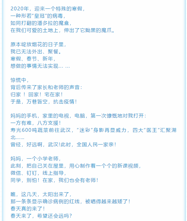 看似是一首诗,可文字背后的力量不容小觑,孩子们用诗歌的形式表达了对疫情的持续关注,对祖国的关切之心,这是作为学生在家中能尽的一己之力。当然,在孩子们的背后还有为学生的学习、身心健康一直默默奉献的老师们,他们是孩子们背后强有力的支撑!面对疫情,携手并肩;面对疫情,众志成城;面对疫情,满怀信心。希望我们共同努力,共同抗击疫情,共同等待春暖花开时,共同期待新学期的到来!